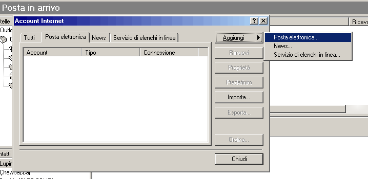 2) Dalla finestra che verrà aperta selezionare Aggiungi, quindi Posta Elettronica