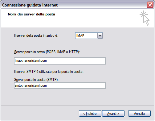 5) Scegliete IMAP nella casella "Il server di posta in arrivo è:", quindi inserire nel campo "Server posta in arrivo" imap.nanosistemi.com e nel campo Server di posta in uscita "smtp.nanosistemi.com"; cliccare su Avanti.