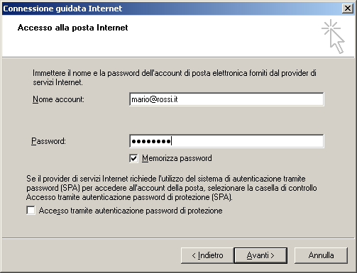 6) Inserire nel campo "Nome account" il proprio indirizzo e-mail e nel campo "Password" la propria password (quella che dovrà inviarci nella risposta a questa e-mail). Selezionare Avanti.