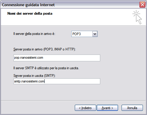 5) Inserire nel campo "Server posta in arrivo" pop.nanosistemi.com e nel campo Server di posta in uscita "smtp.nanosistemi.com"; cliccare su Avanti.