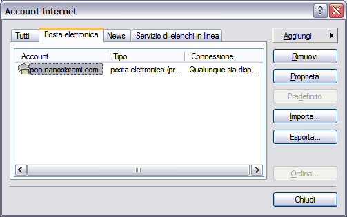 8) Verrà ora visualizzata una finestra in cui appare il nuovo account. Si selezioni l'account con un click singolo del mouse, quindi si clicchi su Proprietà.